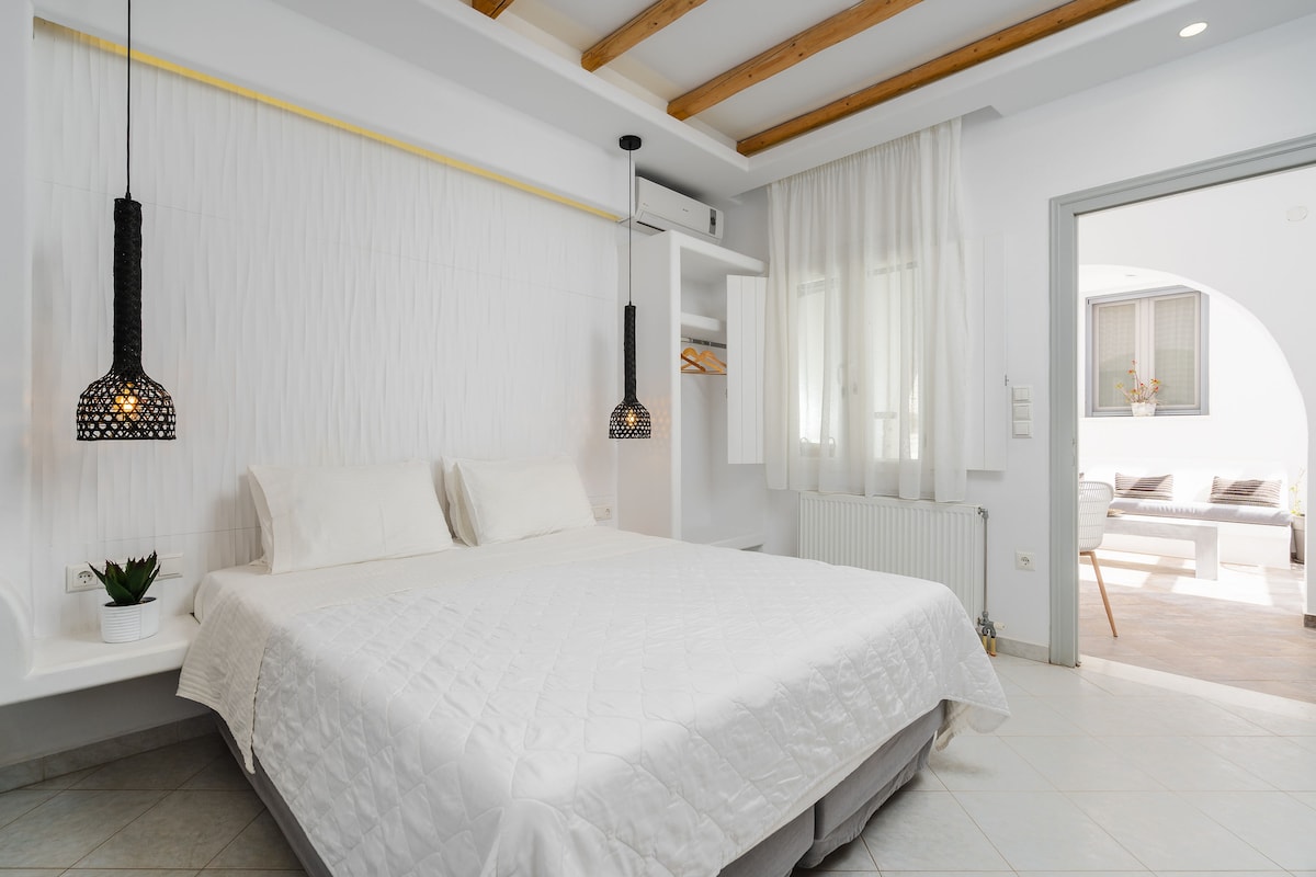 Unsere Junior Suite befindet sich in der Nähe des Strandes von Saint George (5 Min. zu Fuß), des Stadtzentrums von Naxos, des Nachtlebens, der öffentlichen Verkehrsmittel und der Einrichtungen für jedes Alter. Es bietet Klimaanlage, voll ausgestattete Küchenzeile, Smart-TV, Netflix und WLAN-Internet. Die Aussicht auf die Terrasse und das kykladische Design der Suite werden deinen Aufenthalt unvergesslich machen! Der Grill und die bequeme handgefertigte Matratze von Candia Strom bieten dir entspannte Momente mit Stil.