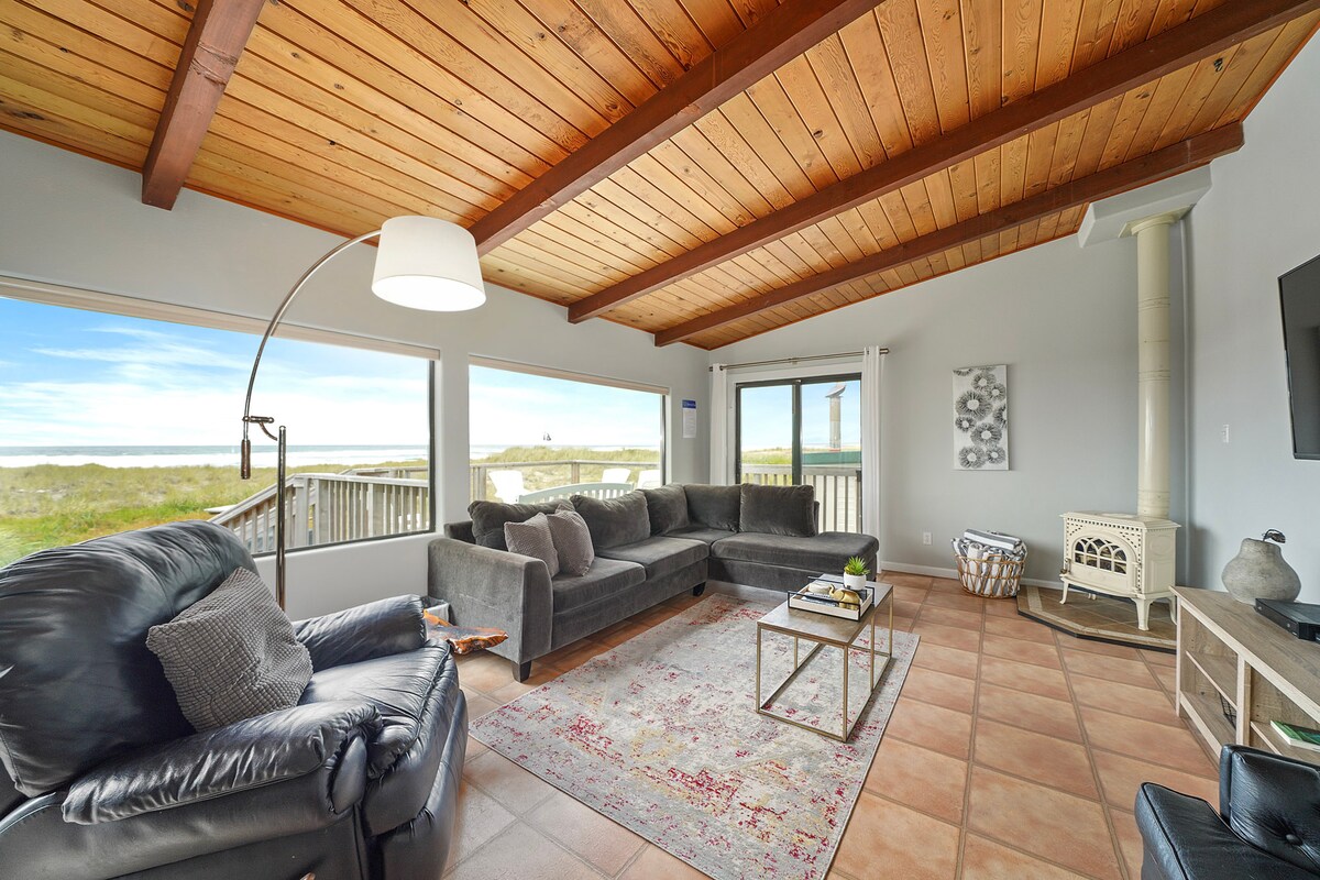 Atemberaubend gelegen, 50 Schritte über das Dünengras vom goldenen Sand von Rockaway Beach entfernt, bietet dieses Haus am Meer eine wirklich spektakuläre Kulisse für deinen nächsten Ausflug an die Küste von Oregon. In dieser wunderschönen Lage nördlich der Innenstadt kannst du von der erhöhten Terrasse aus beobachten, wie die Meereswellen sanft ein- und ausrollen, die voll ausgestattete und kürzlich renovierte Küche genießen und dich im offenen Wohn- und Essbereich mit einer Wand aus Panoramafenstern mit Blick auf das Meer entspannen.