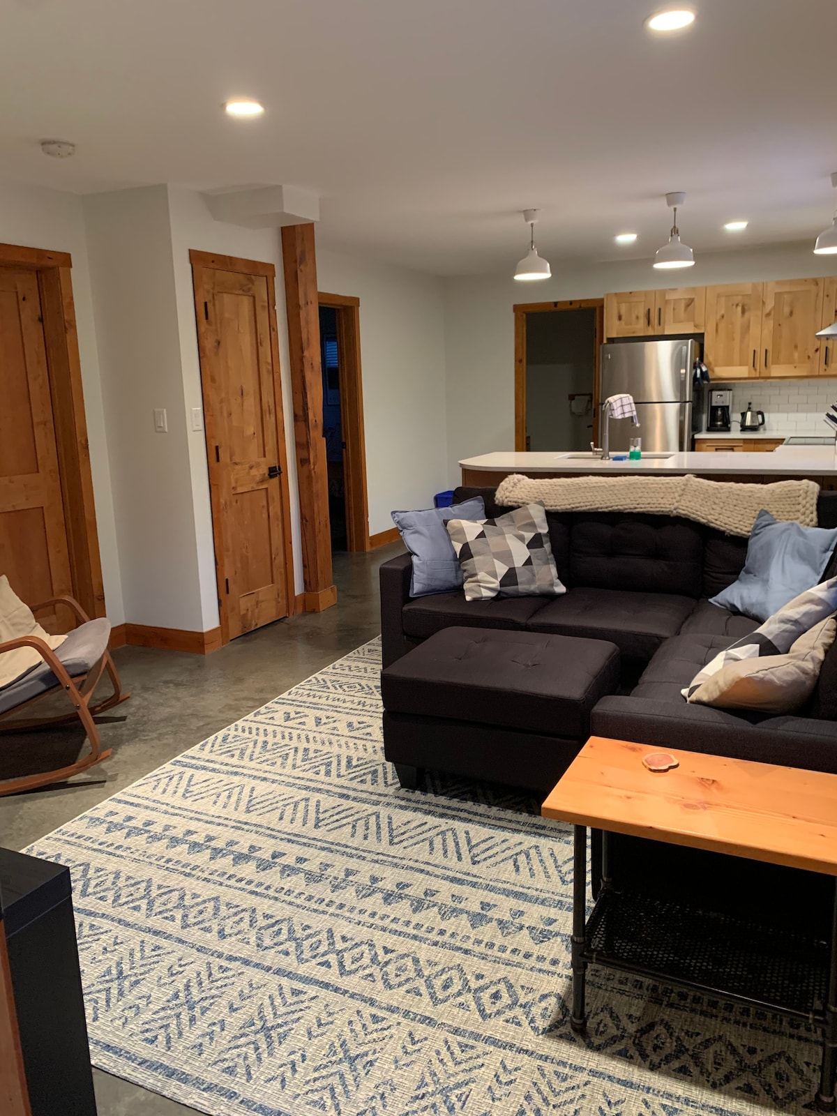 Dieses neu erbaute, maßgeschneiderte Haus verfügt über eine eigene Suite im Untergeschoss. Sie verfügt über ein Schlafzimmer (Kingsize-Bett), ein voll ausgestattetes Badezimmer und einen offenen Wohnbereich mit einer voll ausgestatteten Küche. Es gibt eine Waschmaschine/einen Trockner sowie einen Platz zum Verstauen von Skiern/Fahrrädern und Ausrüstung. Unsere Gäste kommentieren die Unterkunft oft als gemütliche, stilvolle, neue und super saubere Unterkunft! Dieser Raum ist ideal für Menschen, die ihre Tage mit Erkundungen und ihre Abende mit Entspannung verbringen möchten.