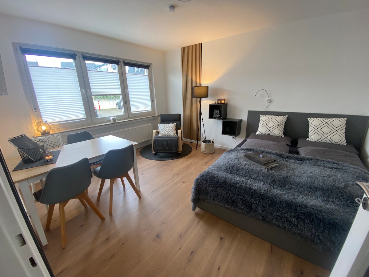 Dieses stilvolle Einzimmer-Apartment wurde aufwändig und mit viel Liebe zum Detail saniert. Vom Apartment aus genießt du einen traumhaften Blick auf den schönsten Wald im Rheinland. Die 2,7 Meter hohen Decken und das Sonnenlicht-Dachfenster schaffen eine helle, offene Atmosphäre mit Blick in den Himmel. Für höchsten Komfort sorgt eine effiziente Fußbodenheizung, die angenehme Wärme verbreitet. Die bodengleiche Regendusche verwandelt dein Duscherlebnis in pure Entspannung.