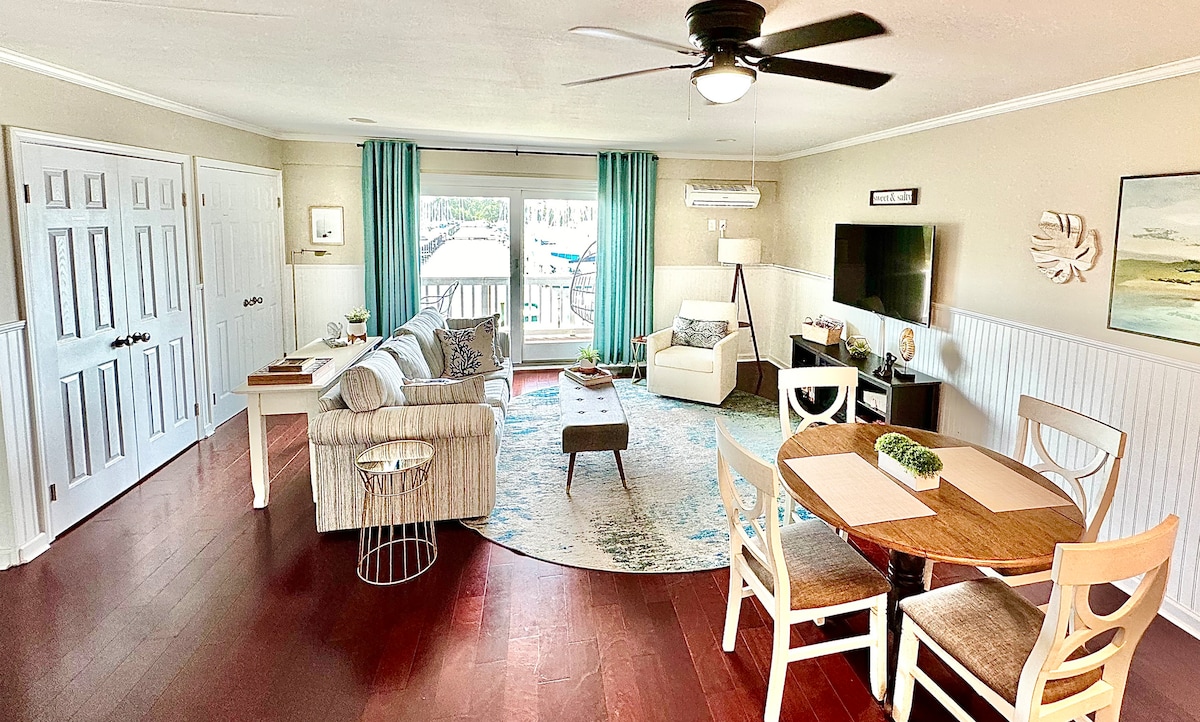 Genieße einen Hauch frischer Luft in dieser schicken Eigentumswohnung im dritten Stock mit 2 Schlafzimmern und 2 Bädern mit Blick auf Taylor Creek, Carrot Island, gelegentliche Delfinschulen oder Wildpferde und alles, was Beaufort zu bieten hat! Genieße den Duft der Holzofenpizza von Black Sheep, die auf den Balkon weht, nimm eine Fähre nach Shackleford, mache einen Spaziergang entlang der Front St oder entspanne einfach auf einer von zwei Außenterrassen in der Sonne. Wenn du auf der Suche nach einem Ort zum Entspannen bist, bist du hier richtig! Ideal für ein oder zwei Paare oder eine Familie! Bis bald!