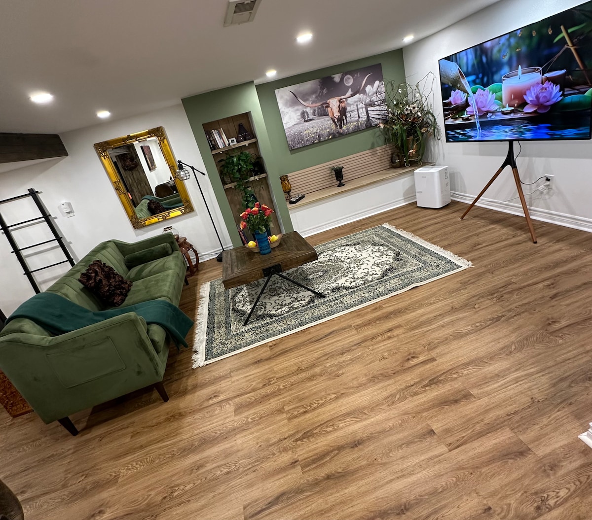 Untere Ebene: Geräumige Einzimmerwohnung mit eigenem Eingang, kostenlosen Parkplätzen, eigenem Waschraum, ebenerdiger Dusche, Queensize-Bett, Schlafsofa für zwei zusätzliche Gäste, 55-Zoll-Smart-TV mit Netflix-Zugang, kostenlosem WLAN, Lufttrockner, Bügeleisen, Staubsauger, voll ausgestatteter Küche mit Herd und Kaffeemaschine. KEIN HAUSTIER, RAUCHEN VERBOTEN, nicht für Kinder geeignet. Kostenloser Wäschezugang für Gäste, die eine Woche oder länger bleiben.