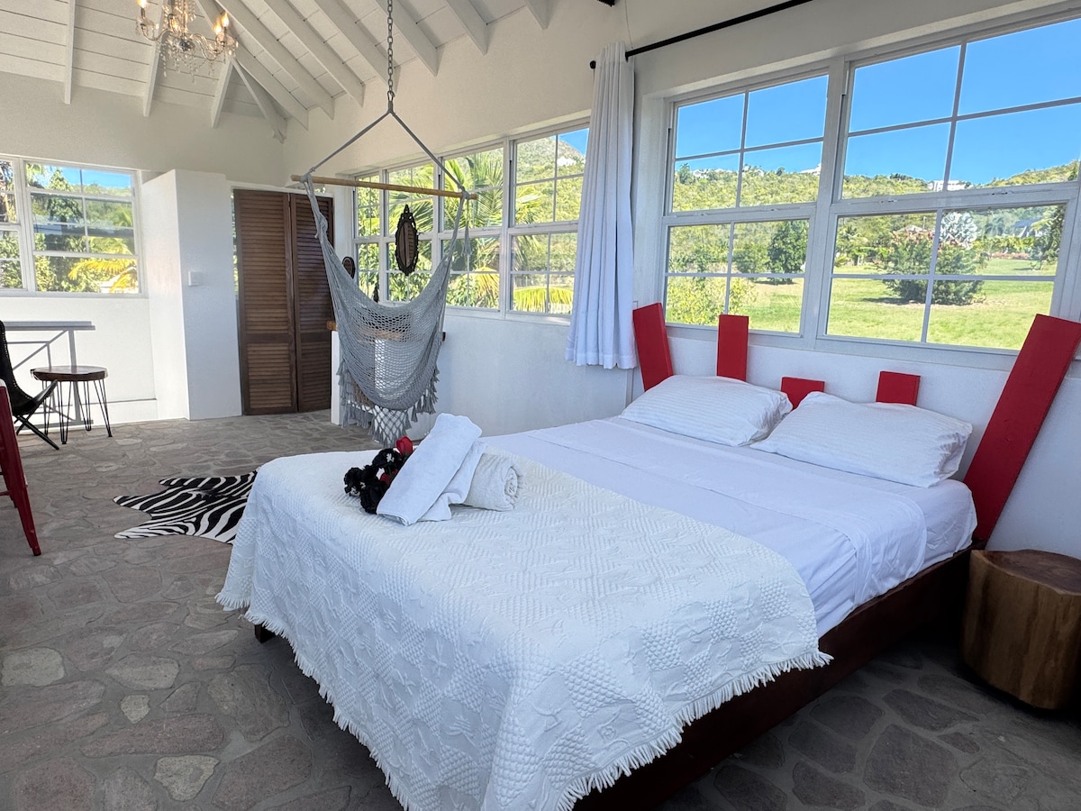 Brandneue, einzigartige und ruhige Unterkunft mit herrlichem 180-Grad-Panoramablick nach Osten/Westen auf den Vulkan und das Meer. Die „Freebird“-Schlafzimmersuite auf der Insel Nevis ist aus dem schicken exzentrischen Lebensstil ihrer weltgereisten Besitzer entstanden. Dekoriert mit einem Hauch von mediterranem Chic, Ultra-Lounge & romantischen westindischen Grooves ❤️ 1 Bett / 1 Bad mit freistehender Badewanne & romantischen Akzenten bei Kerzenschein Genieße es, von diesem wirklich fantastischen Rückzugsort aus die Affen, den Mondaufgang und den Sonnenuntergang zu beobachten.