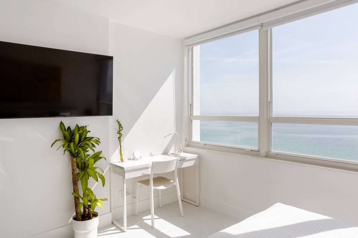 Willkommen im Pure Miami Beach! Entfliehe diesem modernen Studio am Strand im sonnigen Miami Beach, Florida, mit atemberaubendem 180° Meerblick. Entspanne dich in einem gemütlichen Kingsize-Bett, streame auf einem 65-Zoll 4K-Samsung-Fernseher oder arbeite mit privatem 300 MB WLAN und Ethernet-Verbindungen. Bleib fit im renovierten Fitnessraum und entspanne dich dann am funkelnden Pool mit direktem Strandzugang, Liegestühlen und einer Tiki-Bar für tropische Getränke und Häppchen. Kostenlose Parkplätze, luxuriöse Oberflächen und endlose Meeresatmosphäre machen dies zum ultimativen Kurzurlaub!