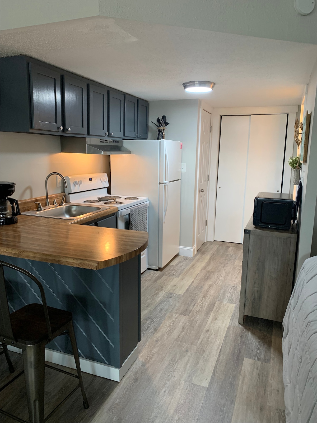 Entspanne dich im effizienten Raum mit Küche, Queensize-Bett und begehbarer Dusche. Die Couch lässt sich zu einem Queensize-Bett ausziehen. Ein paar Schritte von deiner Tür entfernt befindet sich ein Salzwasserpool mit Blick auf den See. Badetücher/Geschirrtücher werden bereitgestellt, aber KEINE BETTWÄSCHE. Smart-TV für Streaming und Xfinity Highspeed-Internet. KEIN Boots-/Anhängerparkplatz an der Wohnung. Parkway Marina berechnet 10 US-Dollar für den ersten Tag und 6 US-Dollar für zusätzliche Tage, um Boot/Anhänger einzusetzen, herauszunehmen und zu parken. Wir befinden uns 2 Minuten (0,7 Meilen) von Parkway Marina entfernt.
