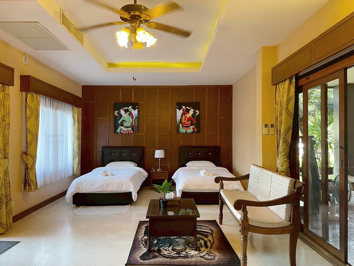 Suwarnburi House , ein einzigartiges thailändisches Haus im authentischen Stil in einer grünen und floralen Atmosphäre. Das Haus verfügt über insgesamt fünf separate Zimmer, die zwei als Zweibettzimmer und die anderen drei als Doppelzimmer ausgestattet sind (jedes Zimmer verfügt über ein eigenes Bad). Es gibt einen Außenpool und einen Whirlpool, ein wunderschön eingerichtetes Esszimmer und verschiedene Sitzbereiche in den Räumlichkeiten.