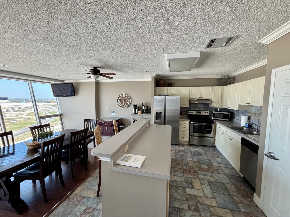 This is it! Experience amazing views of the speedway while you sit comfortably in the living area with a wall of windows overlooking the racetrack. A tabletop arcade in the condo, and access to the pool, pickleball courts, and gym will keep you entertained. If you get stir crazy visit the Tanger outlets right across the street, or head to one of the many restaurants in Roanoke! Fully equipped kitchen 2 rooms with king size beds and attached bathrooms. Down the street from new Stars Center!