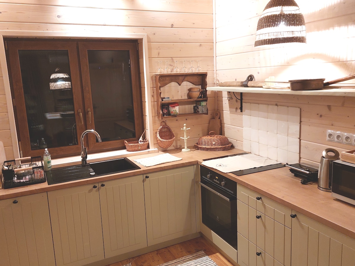Ich habe ein gemütliches Holzhaus zu bieten. Der Vorteil des Hauses ist der Raum, die Steinterrasse und der Platz zum Feuer machen und Grillen. Das einzigartige Haus auf dem Land hat eine einzigartige Atmosphäre und ist von Herzen eingerichtet, man kann sich wie zu Hause fühlen. Unten befindet sich ein kleines Wohnzimmer mit einem bequemen Sofa, wo Sie sich entspannen, lesen, fernsehen können (Bibliothek vorhanden) Im Wohnzimmer befindet sich eine Holzkiste mit einer Yogamatte, Gurten, Blöcken und Decken.