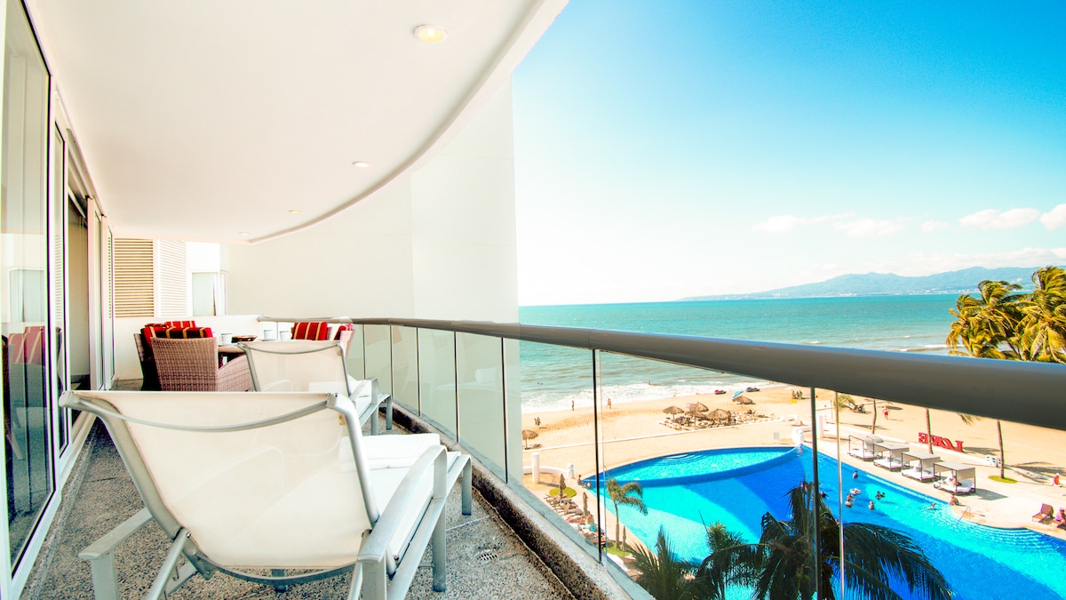 Ideales Studio für 2 Erwachsene und 2 Kinder, nur 10 Gehminuten vom Strand entfernt. Es verfügt über ein Queensize-Bett, ein Schlafsofa, eine Küchenzeile, ein Badezimmer, einen 55-Zoll-Fernseher, einen geräumigen Kleiderschrank, einen privaten Parkplatz, einen Zimmerservice und einen Service am Pool. In der Nähe eines Einkaufszentrums, direkt neben dem LIV Fertility Center, 15 Minuten vom Flughafen und 25 Minuten von der Innenstadt von Vallarta entfernt. Das Restaurant auf dem Dach bietet Frühstück, Mittag- und Abendessen an. Perfekt für kleine Familien.