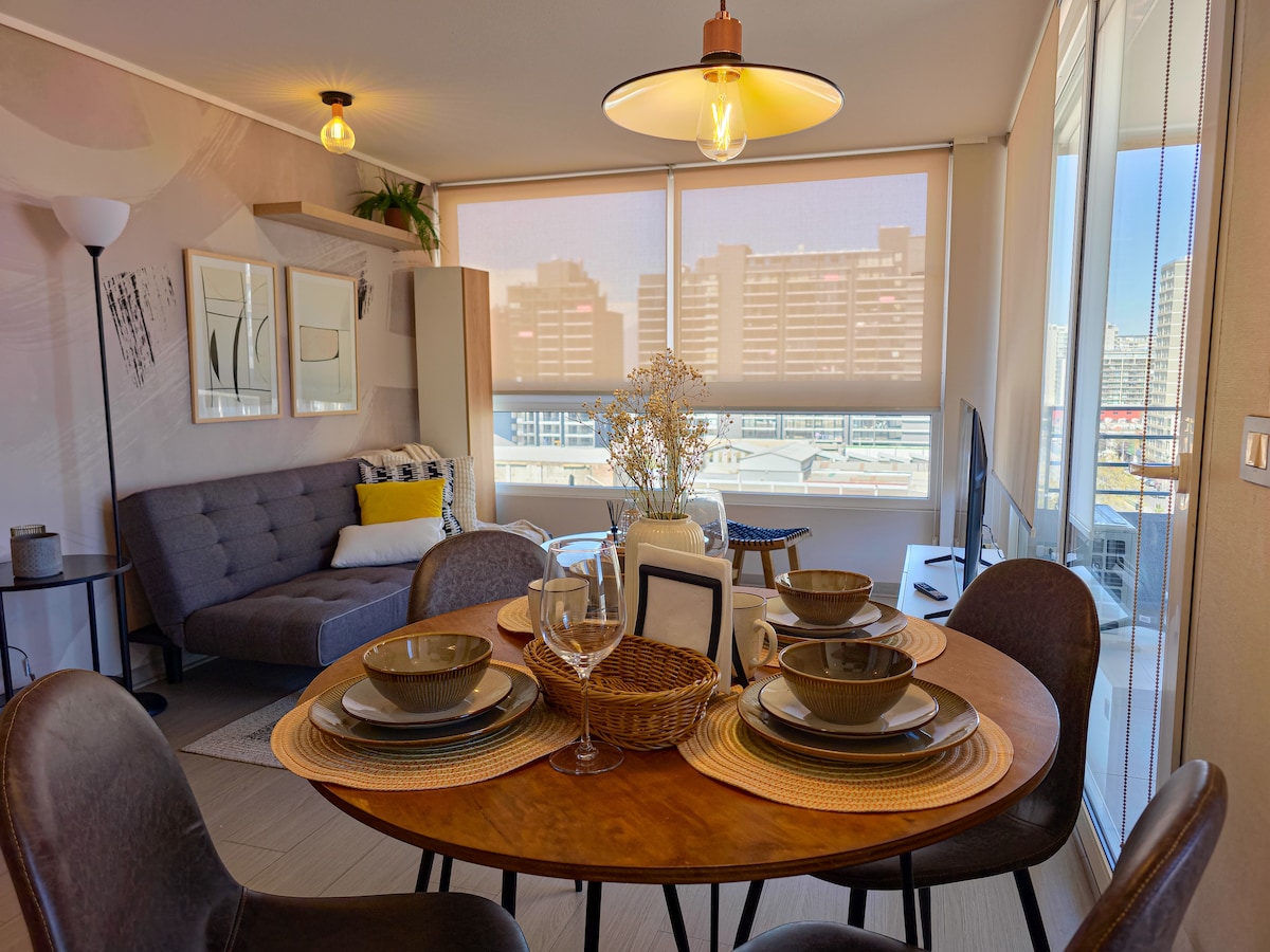 Ein warmer und ruhiger Raum, der entworfen wurde, um sich wirklich auszuruhen, ruhig zu arbeiten und sich von der ersten Minute an wie zu Hause zu fühlen. Die Parkmöglichkeiten unterliegen der Verfügbarkeit (Kosten 4.000 chilenische Pesos pro Tag). Warmes Japandi-Design mit Klimaanlage, voll ausgestatteter Küche und Holzdetails. Es ist ideal für Reisende, die Komfort, Ordnung und eine ruhige Atmosphäre zum Ausruhen oder Arbeiten suchen. Entspanne dich in einer harmonischen und ausgestatteten Umgebung für einen ruhigen Aufenthalt.