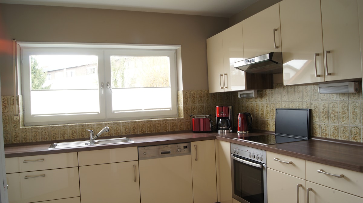 Genieße diese 2-Zimmer-Wohnung mit 65 qm in einer ruhigen Sackgasse. Die Wohnung befindet sich in einem Zweifamilienhaus im Erdgeschoss. Die Wohnung verfügt über einen Wohn-und Essbereich (großer Fernseher) mit angrenzender kleinen Küche. Im Wohnbereich gibt es auch einen Arbeitsplatz. Das Schlafzimmer hat ein Box-Springbett 1,80x200 und einen großen Kleiderschrank. Einen Fernseher gibt es im Schlafzimmer auch. Das Badezimmer hat eine Badewanne, aber man kann auch duschen.