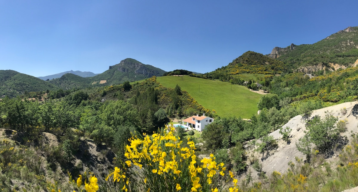 « La Genestière » Charmant mas provençal datant de la fin du XIXème siècle, La Genestière surplombe les collines des Baronnies, offrant une vue panoramique exceptionnelle sur le Mont Ventoux et le village de Mirabel-aux-Baronnies. Elle est entourée de plusieurs hectares de vignobles d’appellation Côte du Rhône et de magnifiques vergers d’oliviers.