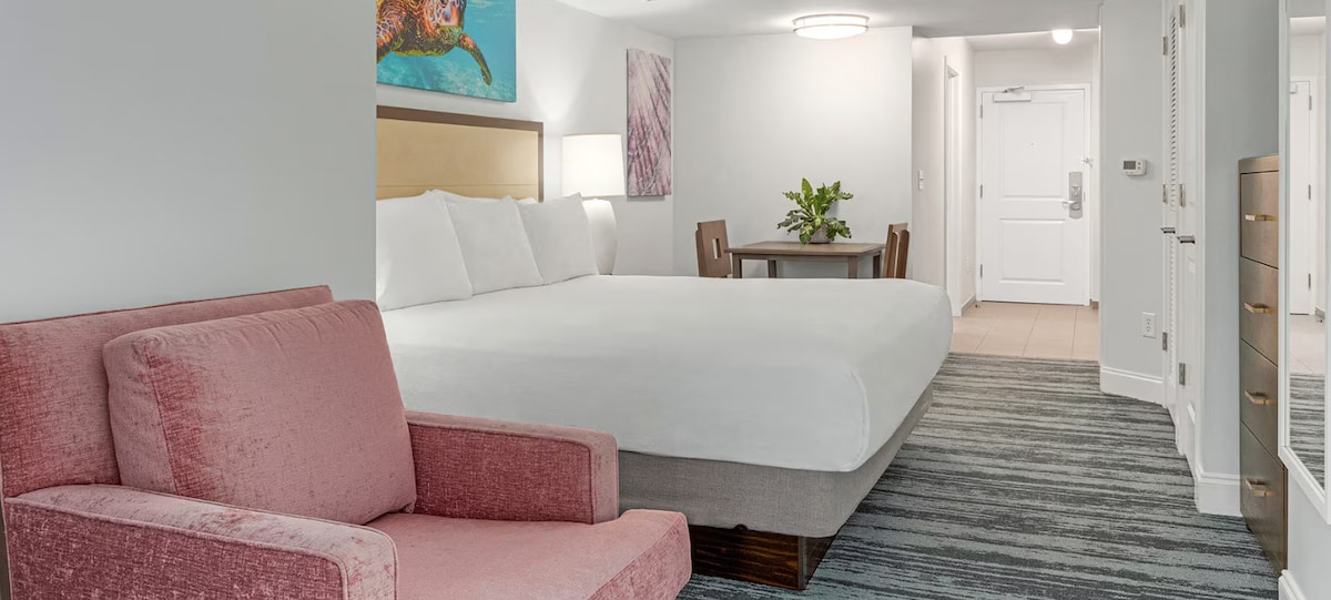 Diese geräumige Resort-Suite mit einem Schlafzimmer misst etwa 466 Quadratfuß. Du wirst 2 zwei Doppelbetten oder ein Kingsize-Bett im Hauptschlafzimmer und ein Schlafsofa im Wohnzimmer genießen. Zu den weiteren Annehmlichkeiten gehören eine voll ausgestattete Küche und ein Essbereich, eine Waschmaschine/ein Trockner und ein Balkon mit Meerblick. Die maximale Belegung beträgt vier. Privater Schlafbereich für zwei Personen. Die Preise und Verfügbarkeit variieren, also kontaktiere den Gastgeber, um dich nach deinen Reisedaten zu erkundigen