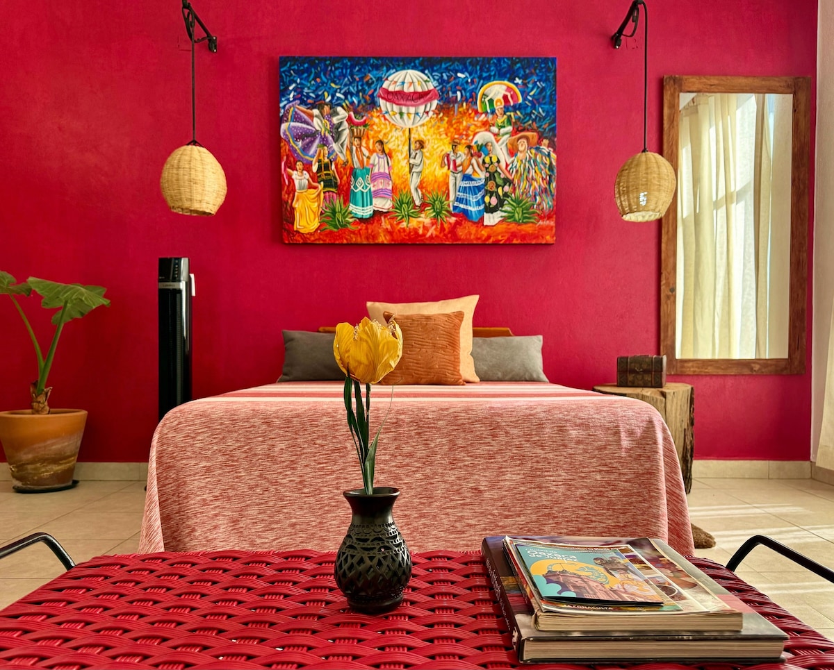 Rustikale Suite mit eigenem Eingang. Es verfügt über ein geräumiges Schlafzimmer mit einem Queensize-Bett, einem Schlafsofa, einem Smart-TV und einer Klimaanlage. Ein Wohnzimmer mit einem Esszimmer und einem separaten Badezimmer, ideal für Paare oder 3 Reisende, die die Innenstadt von Oaxaca erkunden möchten. Nur 4 Gehminuten von Cruz de Piedra, 8 Gehminuten vom Tempel Santo Domingo de Guzmán und 12 Gehminuten vom Auditorium Guelaguetza entfernt. Genieße die Magie von Oaxaca von einer erstklassigen Lage aus!