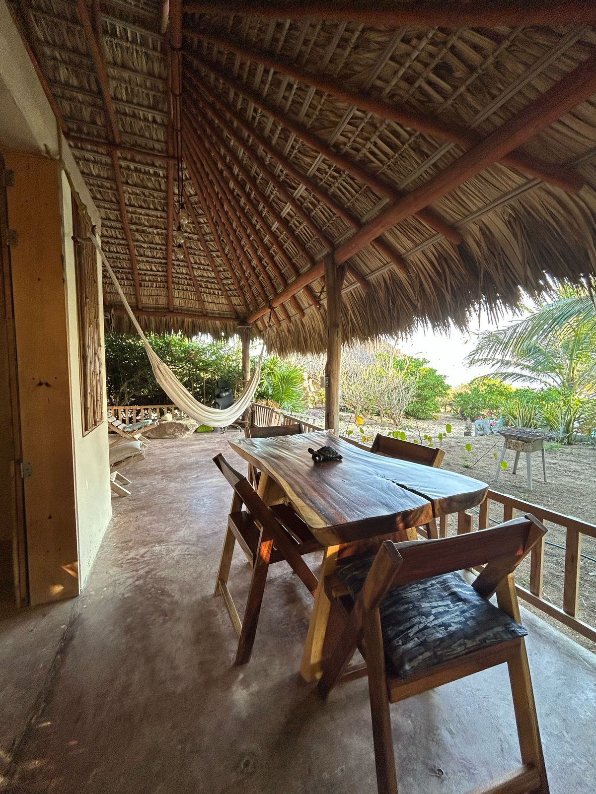 Die Cabaña Rinconcito, nur wenige Meter vom Strand entfernt, verfügt über 2 Doppelbetten, Hängematten, WLAN, gereinigtes Wasser, eine eigene Küche, Kühlschrank und ein eigenes Bad. Umgeben von Bäumen, ihren Tieren und Vögeln fühlt man sich als Teil der Natur. Wenn Sie gerne campen, ist dieses rustikale Ferienhaus mit seinem Palmendach genau das Richtige für Sie. Das Schlafzimmer hat ein Moskitonetz über seinem bequemen Bett und auch das Bett unten im Wohnzimmer. Es gibt Meerblick von den Hängematten im Raum.