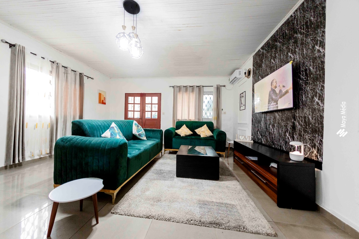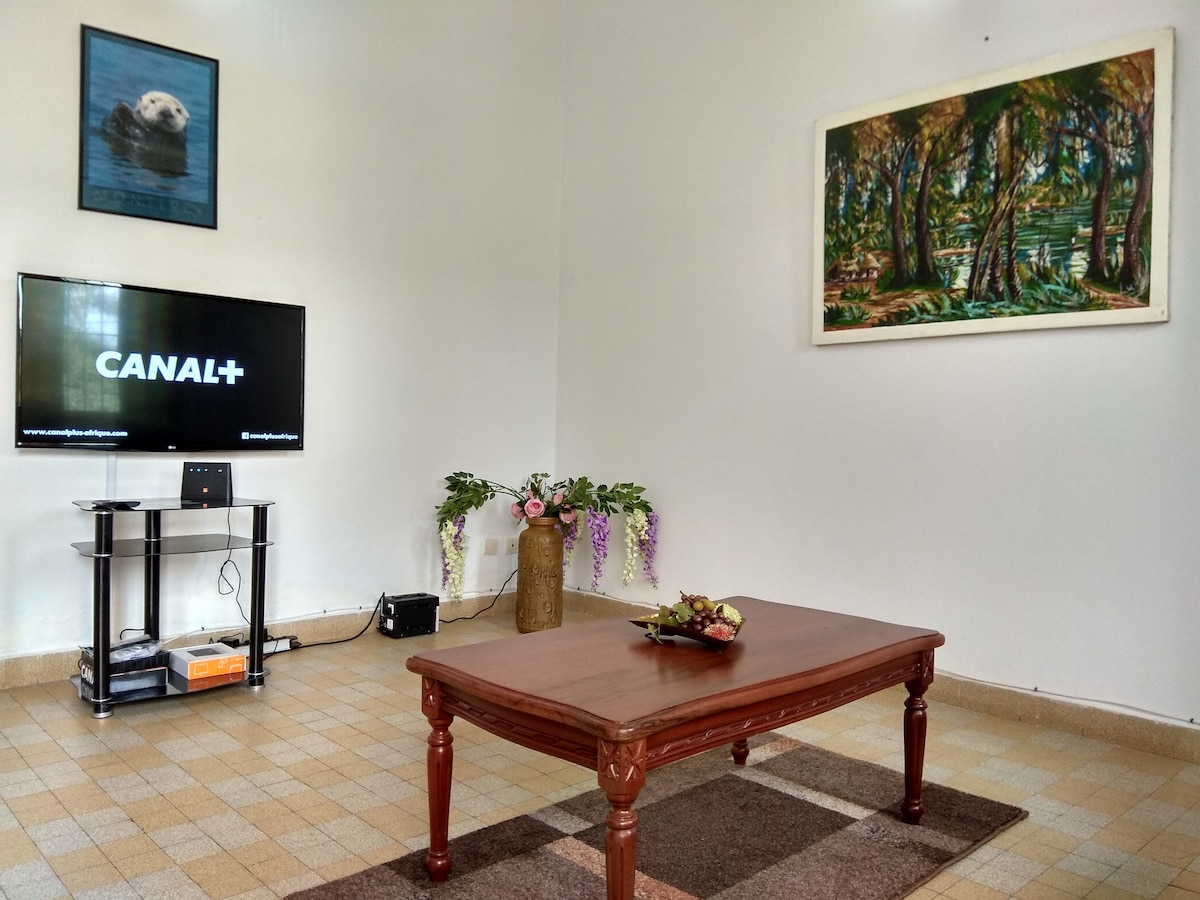 Sichere Residenz, ideal für Geschäftsreisende in Yaoundé. In einem prestigeträchtigen institutionellen Umfeld (Präsidentschaft, US-Botschaft, Golf) gelegen, bietet es Komfort und Gelassenheit. Zugang über asphaltierte Straße, High-Speed-WLAN, leiser Generator, 20.000 l Wasserreserve, Safes, Kameras und 24-Stunden-Überwachung. Reinigung inklusive und Waschküche vorhanden.