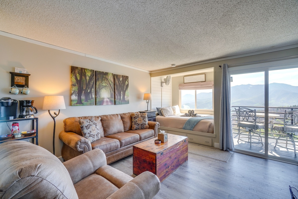 Der Gatlinburg Summit Complex liegt auf 3.000 Fuß und bietet einen unvergleichlichen Blick auf die Smoky Mountains. Unser neu renoviertes modernes Studio verfügt über einen eigenen Balkon mit ruhigem Blick auf den Wald und einen fernen Blick auf das Tal. Neuer elektrischer LED-Kamin, neue Möbel, neu renovierte Küche mit Granit-Arbeitsplatten, privates High-Speed-WLAN, HD-Kabel und Smart-TVs. Queensize-Bett aus Memoryschaum und Couch mit Queensize-Schlafsofa aus Memoryschaum. Vor Ort gibt es einen Außen- und Innenpool, zwei Whirlpools, ein Clubhaus, einen Spielplatz und Picknick/Grill.
