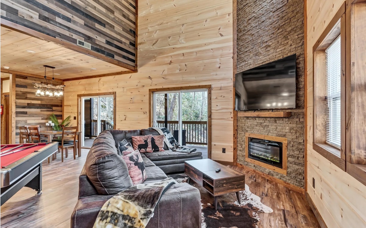 Entfliehe in unser luxuriöses Bergchalet, wo dich der Blick auf die Smoky Mountains und moderner Komfort erwarten! Entspanne dich am einzigartigen 3-seitigen Kamin, im Wohnbereich mit einem 65-Zoll-Smart-TV oder im Whirlpool mit Panoramablick auf die Berge. Die Gourmetküche mit Edelstahlgeräten, Espressomaschine und Essbereich für 8 Personen macht jede Mahlzeit unvergesslich. Genieße ein Spielzimmer mit Pool, Multicades und sogar einer Kletterwand. Das Hauptschlafzimmer verfügt über eine Badewanne am Fenster und bietet einen atemberaubenden Blick auf die Berge.