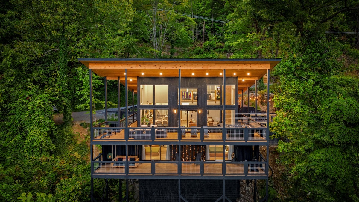 Newly built cabin in the Great Smoky Mountains. With accommodations for up to 12 guests, this unique mountain retreat offers 2 suites, a bonus room, 3 full bathrooms, and 2 half bathrooms. This 2,900 sqft cabin is outfitted with comfortable living and dining areas, fireplace, fully equipped kitchen, game room, theater, patios, balcony, and a spacious deck, where you can gather around the grill, or heated swim spa.