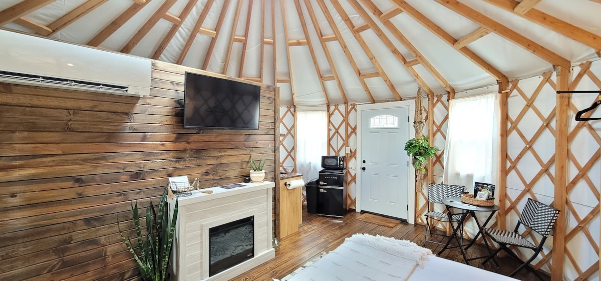 Gönn dir Familienkomfort in unserer Jurte, die Platz für 6 Gäste bietet. Erlebe einen gemütlichen Rückzugsort mit einem Queensize-Bett im ersten Schlafzimmer und 2 Etagenbetten im zweiten. Genieße eine voll ausgestattete Küche, einen Essbereich und ein komplettes Badezimmer. Die Unterhaltung steht dir mit einem Fernseher zur Verfügung, während die Annehmlichkeiten im Freien einen Blackstone-Gasgrill, einen Feuerring und eine Terrasse mit Stühlen umfassen. Genieße die Natur mit einem Picknicktisch und schaffe Erinnerungen in einer Jurte, die modernen Komfort mit der Schönheit der Natur verbindet.