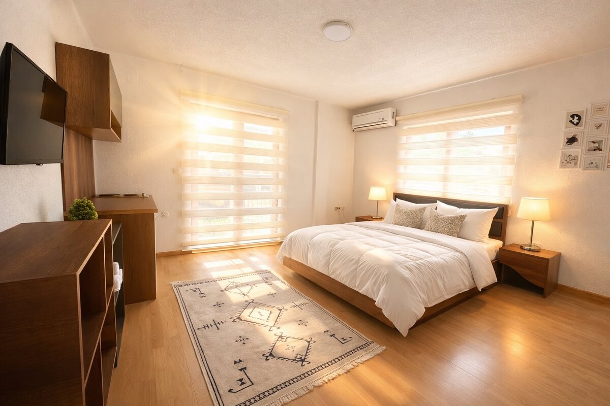 Willkommen in meiner Unterkunft, einer geräumigen und stilvollen Wohnung, die sich gleichzeitig gemütlich und luxuriös anfühlt. Sie bietet alles, was du brauchst, um dich wie zuhause zu fühlen: ein separates Schlafzimmer für einen erholsamen Schlaf und ein Wohnzimmer, das sich bei Bedarf leicht in ein zweites Schlafzimmer verwandeln lässt. Egal, ob du als Paar, mit Freunden oder der Familie kommst, es gibt viel Platz zum Entspannen. Es ist ruhig, hell und durchdacht gestaltet mit einer Mischung aus natürlichem Holz, sanfter Beleuchtung und einer sauberen, ästhetischen Atmosphäre.