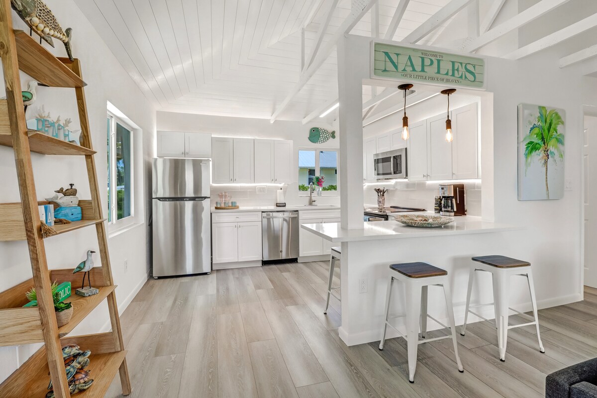 Willkommen in deiner neu renovierten Eigentumswohnung im Herzen von Olde Naples! Nur EINEN BLOCK von den schönen Stränden von Naples und allen Geschäften und Restaurants in der 3rd Street entfernt! Deine Eigentumswohnung im ersten Stock liegt ideal nur wenige Schritte vom übergroßen beheizten Pool entfernt. Und mit großen Fenstern kannst du den warmen Sonnenschein Floridas hereinlassen. Das Studio verfügt auch über einen ausgewiesenen Parkplatz, eine Gemeinschaftswäscherei, eine Küche, ein Badezimmer, einen Esstisch, ein Kingsize-Bett, ein ausziehbares Einzelausziehbett und bietet Platz für bis zu 3 Personen.