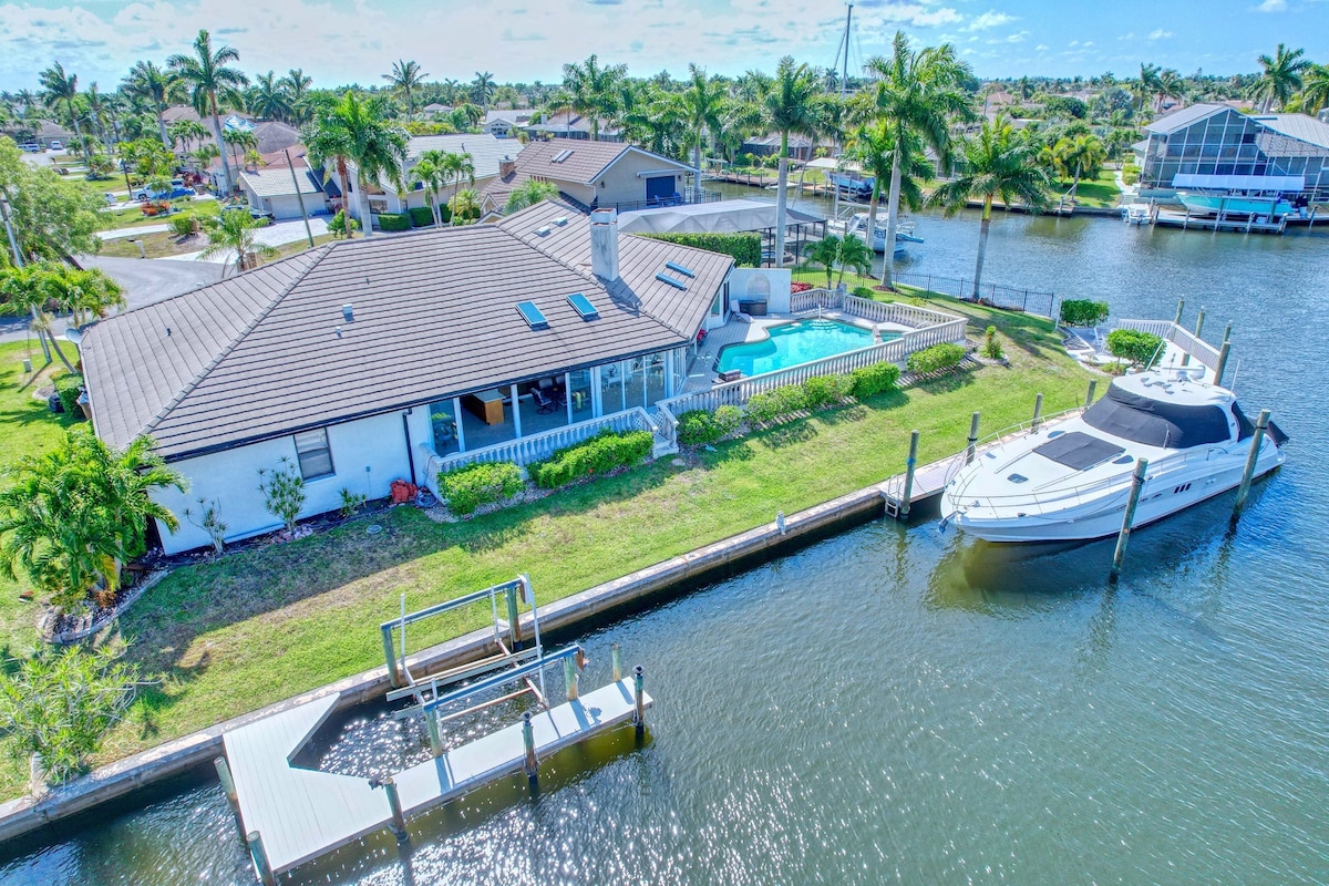 EINE DER BESTEN UFERGEGENDEN IN CAPE CORAL! Nur einen kurzen Spaziergang vom Strand entfernt. Dieses über 230 Quadratmeter große Haus bietet atemberaubende Sonnenuntergänge und einen südwestlichen Blick auf das Wasser von allen wichtigen Wohnbereichen sowie der Master Suite. Beheizter Pool mit farbiger LED-Beleuchtung, eingebautes Spa, Poolbad, komplette Waschküche, Lanai, Kamin, WLAN und TVs in jedem Schlafzimmer, privater Anlegesteg. Boot auf Hebebühne zu vermieten bei RPM-Vermietungen. Große 2-Auto-Garage mit 5 Fahrrädern, Strandwagen und Kühler vor Ort.
