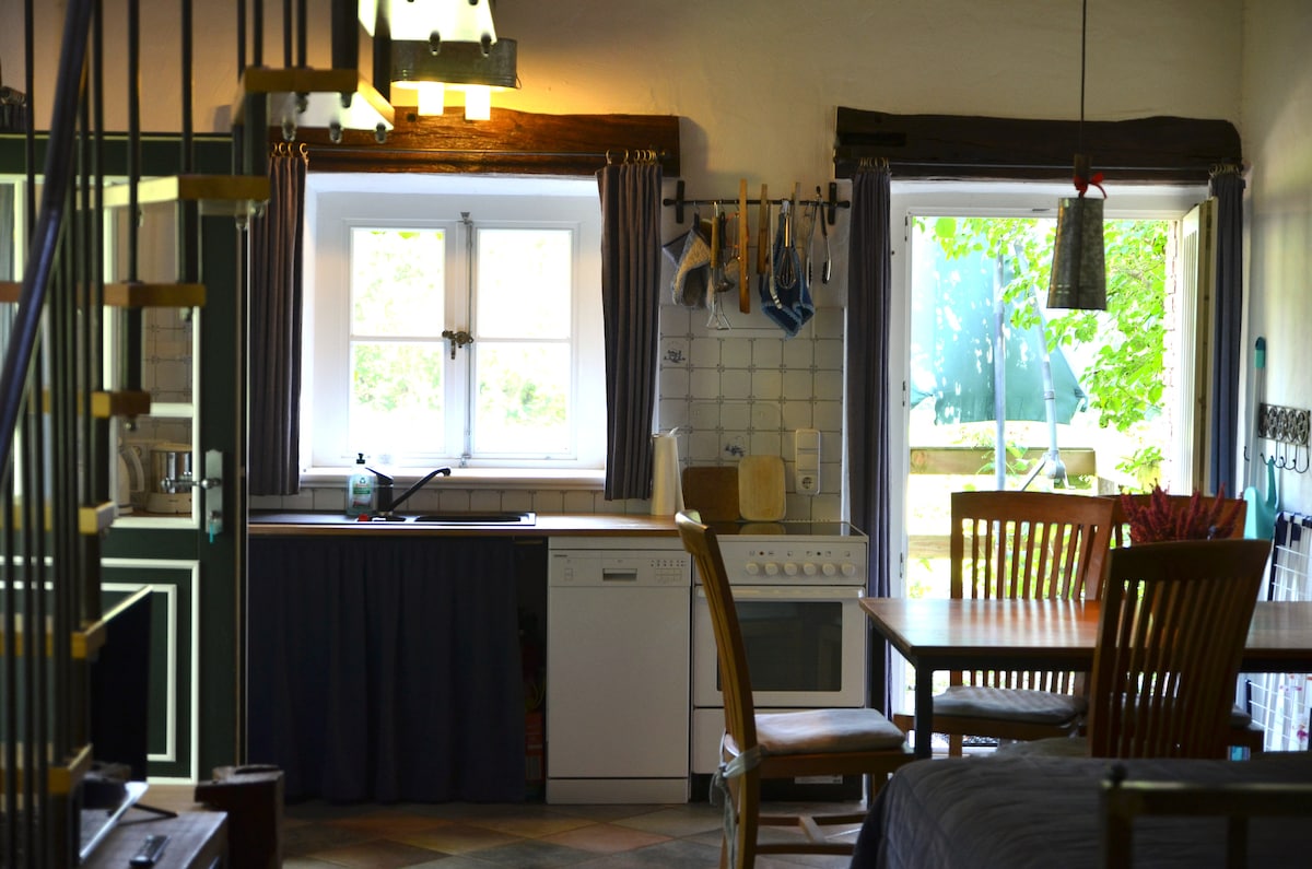 Abgeschieden und ruhig, können Sie es sich auf 60 Qudratmetern gemütlich machen. Hochwertig verarbeitetes Holz macht die Wohnung auf zwei Stockwerken mit Kamin und Terasse, sowie vollausgestatter Küche und 1,5 Bädern zu einem Erholungsort auf dem Land. Ob mit der Familie oder mit Freunden, wer Einfach mal raus will findet hier den richtigen Ort zum Entschleunigen.