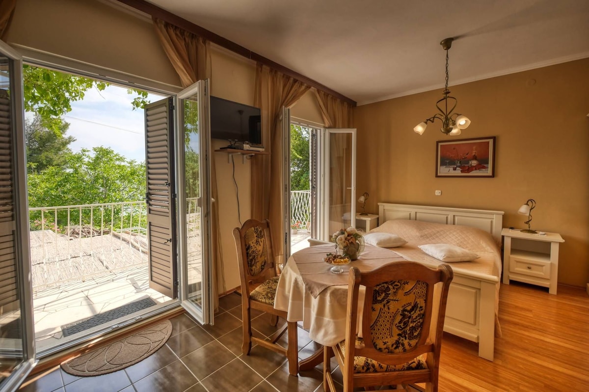 Unser Studio ist ein gemütlicher Ort, ausgestattet mit Küchenzeile, Klimaanlage, SAT/TV, WLAN usw. Sie befindet sich im Erdgeschoss unseres Hauses. Die Wohnung verfügt über eine private Terrasse (16 m²), die von einer Markise bedeckt ist. Die Gäste genießen den Blick auf den grünen Garten und das Meer. Unsere Gäste können gerne unsere sonnige Südterrasse nutzen, die mit der anderen Wohnung geteilt wird, sowie den Swimmingpool. Willkommen!