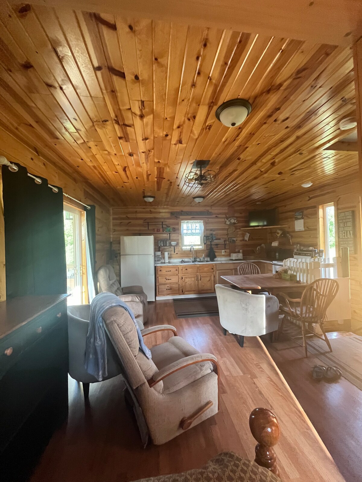 Genieße die Gemütlichkeit einer vergangenen Ära während deines Aufenthalts in dieser malerischen Blockhütte aus den 1940er Jahren. Das Hawks Nest wurde liebevoll restauriert, um seinen ursprünglichen Glanz wiederherzustellen, während alle modernen Annehmlichkeiten durch seinen sauberen 380 Quadratfuß großen Raum verwoben wurden. Ziehe dich auf die geräumige, überdachte Veranda zurück, um dich zu entspannen und das anderthalb Hektar große Grundstück zu betrachten, das bis zu 100 Fuß zum 6Mile Lake führt. Beobachte die Sterne, während du dich in den komfortablen, von den Amish gebauten Vergoldungsstühlen rund um den großzügigen Feuerstellenbereich entspannst.