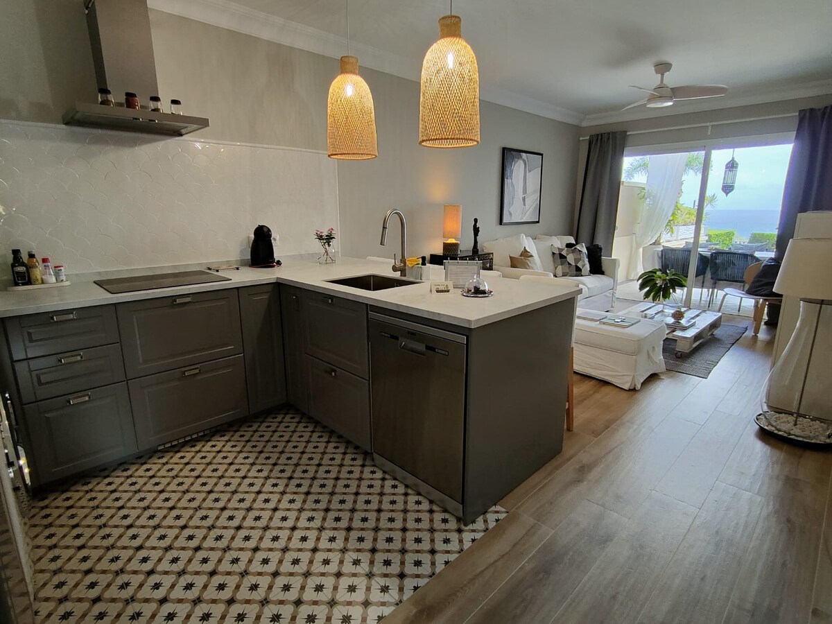 Renovierte und elegante Wohnung mit Meerblick. Gemütlich und romantisch. Ausgestattet mit allem Komfort; Musikanlage mit USB und Bluetooth, 43-Zoll-Fernseher, NETFLIX, Disney+ und Satellitenfernsehen. Private Terrasse mit schöner Veranda, perfekt um einen Abend bei Kerzenschein zu genießen, auch kleiner und koketter Garten, ebenfalls privat. Gemeinschaftspool nur 10 Schritte entfernt, mit herrlichem Blick auf das Meer und Puerto de la Cruz. WIR GARANTIEREN SAUBERKEIT, HYGIENE UND KOMFORT.