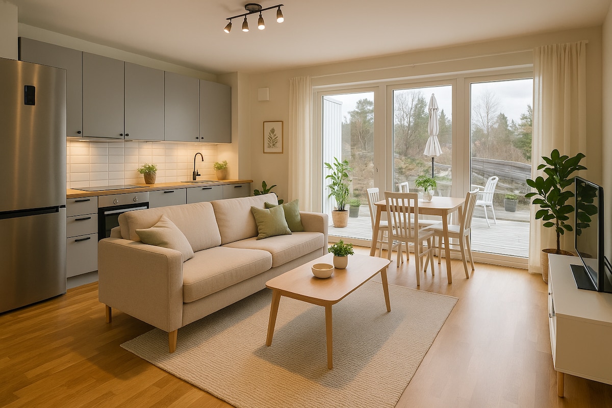 Wir vermieten eine geräumige, helle und voll möblierte 1-Zimmer-Wohnung von 52 m² in unserem Haus aus den 70er Jahren. Die Wohnung verfügt über einen eigenen Eingang und ist komplett mit feinen modernen Materialien renoviert. Die gesamte Wohnung ist mit einer Fußbodenheizung unter dem hellgrauen Betonboden ausgestattet, die sich durch die gesamte Wohnung erstreckt. Neue moderne Küche von Ballingslöv mit allem, was du brauchst, um für eine oder mehrere Personen zu kochen. Die Wohnung verfügt über einen offenen Grundriss.