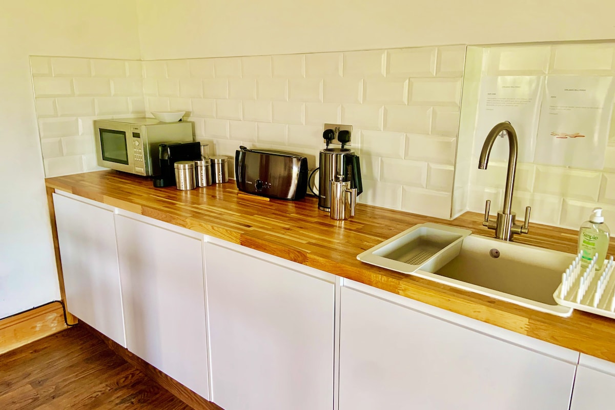 Ein geräumiger Anbau mit einem Schlafzimmer, einer eigenen Küche und einem Duschbad. Über eine eigene Tür (pass auf deinen Kopf auf!) gelangst du in einen kleinen Eingangsbereich, der in einen Küchenbereich, ein Duschbad und weiter in ein großes, nach Süden ausgerichtetes Schlafzimmer mit hohen Decken und großen Fenstern mit Blick auf die Vorderseite des Haupthauses führt. Entspanne dich auf dem bequemen Sofa oder genieße deine Mahlzeiten am Esstisch. Voll ausgestattet für kurze oder längere Aufenthalte. Ein 20-minütiger Spaziergang über die Felder zum Pub The Farmer's Dog.