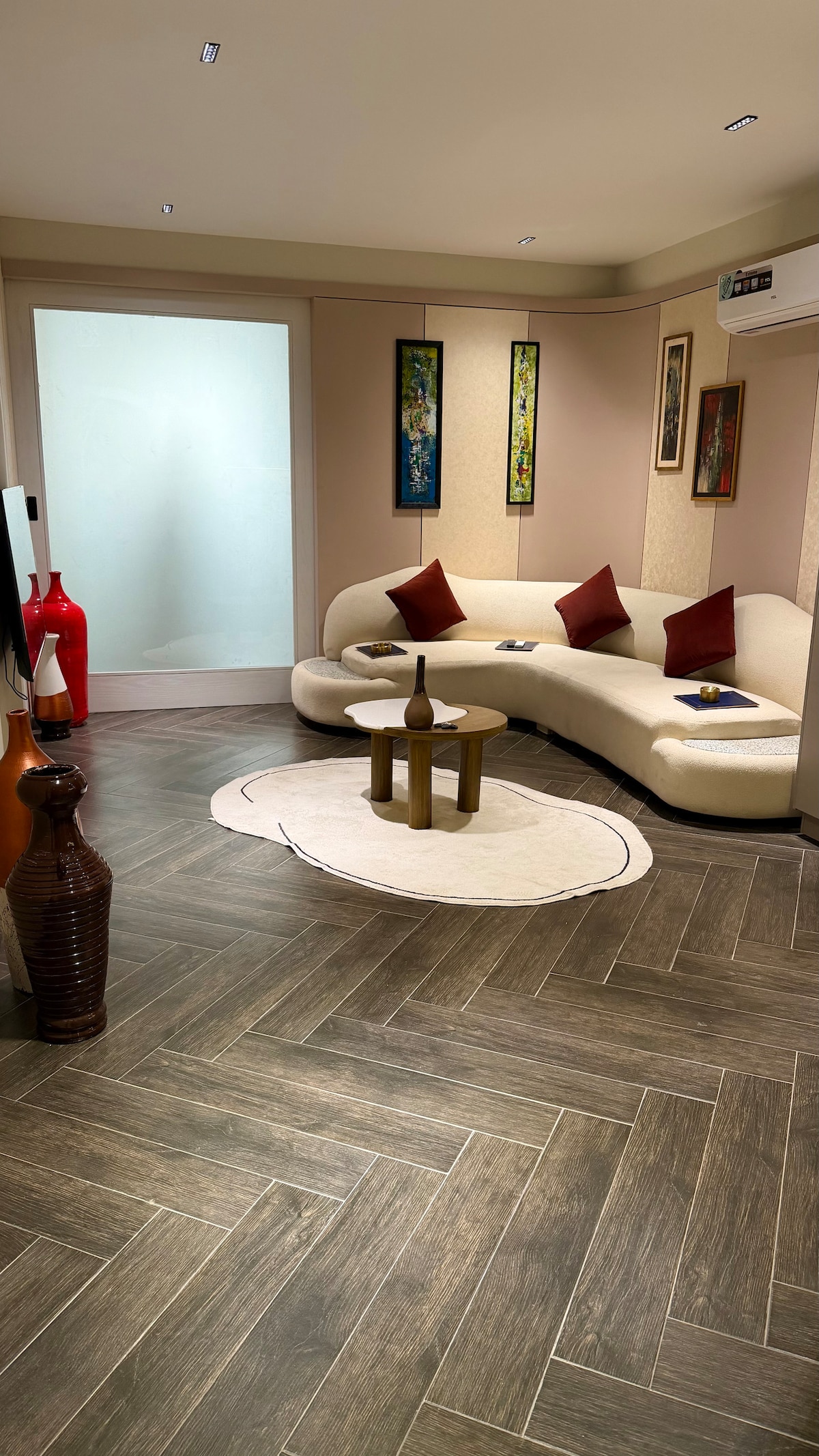Betrete Moonlight by fior, wo moderner Luxus auf ruhiges Ambiente trifft. Dieses elegant gestaltete Apartment verfügt über einen geräumigen Wohnbereich mit elegantem Interieur, der durch eine atemberaubende, vom Mond inspirierte Wandleuchte hervorgehoben wird, die ein beruhigendes Licht erzeugt. Das offene Layout umfasst eine gemütliche Lounge, stilvolles Dekor und ein modernes Entertainment-Setup. Diese Unterkunft ist perfekt zum Entspannen und bietet sowohl Komfort als auch Raffinesse für einen unvergesslichen Aufenthalt.