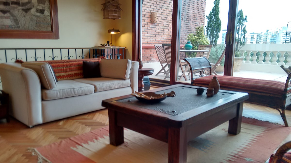 Geräumige Wohnung, Wohn-/Esszimmer, Küche , 2 Badezimmer, 2 Terrassen , TV, WLAN, 2 Schlafzimmer mit Fenstern zu den Terrassen. In Wohngegend, in der Nähe von allem, 100 Meter rollenden Park,, Obelisk von Montevideo, 10 Minuten mit dem Bus in der Innenstadt von Montevideo, Flohmarkt Orange Tristan, Parkmesse 200 Meter, Bowlingbahnen, Restaurants , Cafés 100 Meter.