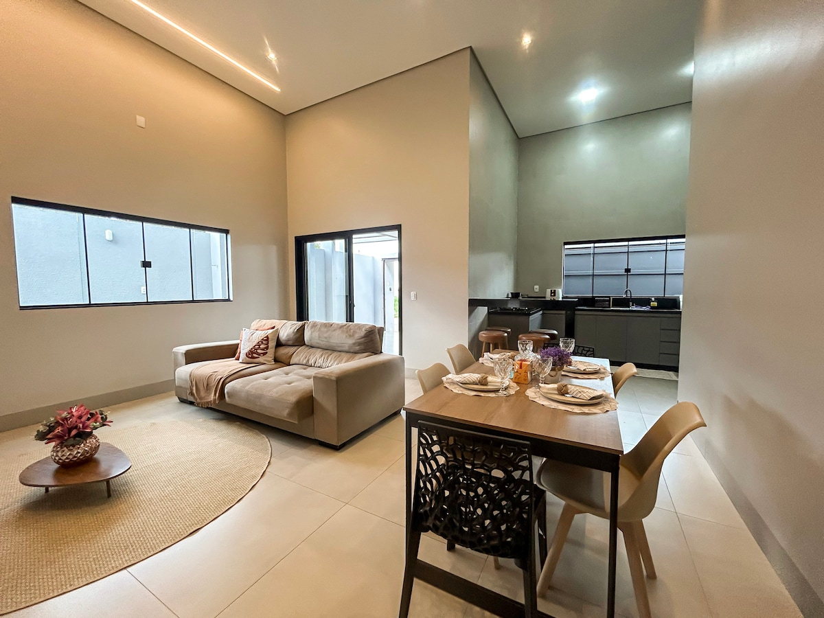 Übernachten Sie in einem neu gebauten Haus mit modernem Design, gut durchdachten Räumlichkeiten und einer gemütlichen, sauberen und organisierten Atmosphäre.Es gibt 3 Schlafzimmer, die voll ausgestattet sind, um Komfort, Zweckmäßigkeit und Ruhe zu bieten — ob für Freizeit, Arbeit oder Studium. Strategische und praktische Lage Minuten von Ulbra und katholischen Universitäten entfernt 14 Minuten (10,9 km) vom Flughafen Palmas entfernt 5 km von Rodoviária entfernt