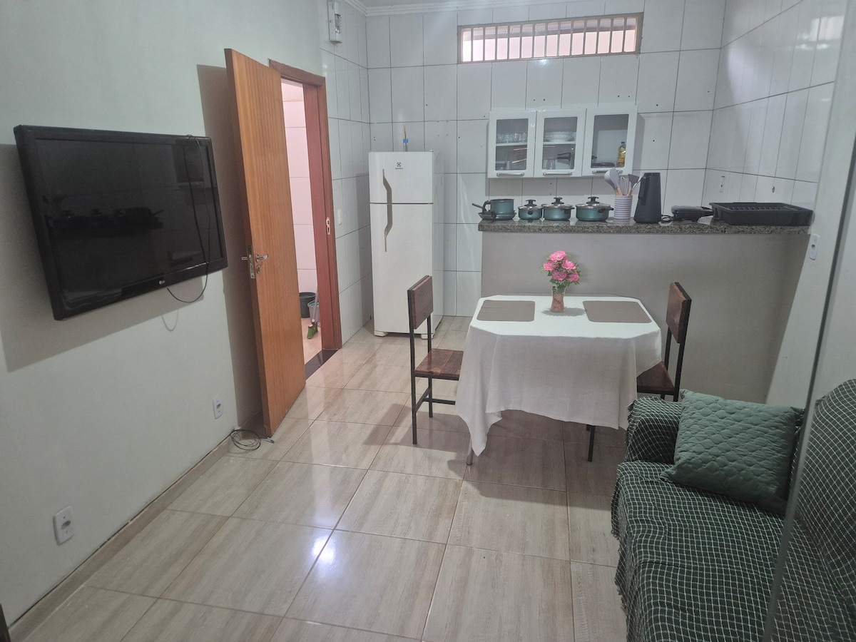 ✨ Willkommen im Flat Aconchego do Aeroporto! Der von unserer Familie durchdacht gestaltete Raum bietet Platz für bis zu 4 Personen und kombiniert Komfort, Boho-Stil und Zweckmäßigkeit. Sie verfügt über ein Wohnzimmer mit einem Schlafsofa und einem TV, ein gemütliches Schlafzimmer, eine ausgestattete Küche (ohne Herd), ein Badezimmer mit einer Warmwasserdusche, einen Arbeitsbereich, eine private Garage und einen unabhängigen Eingang. 15 Minuten vom Flughafen entfernt, ist es ideal für diejenigen, die Komfort und Gastfreundschaft suchen! 🏡✈️