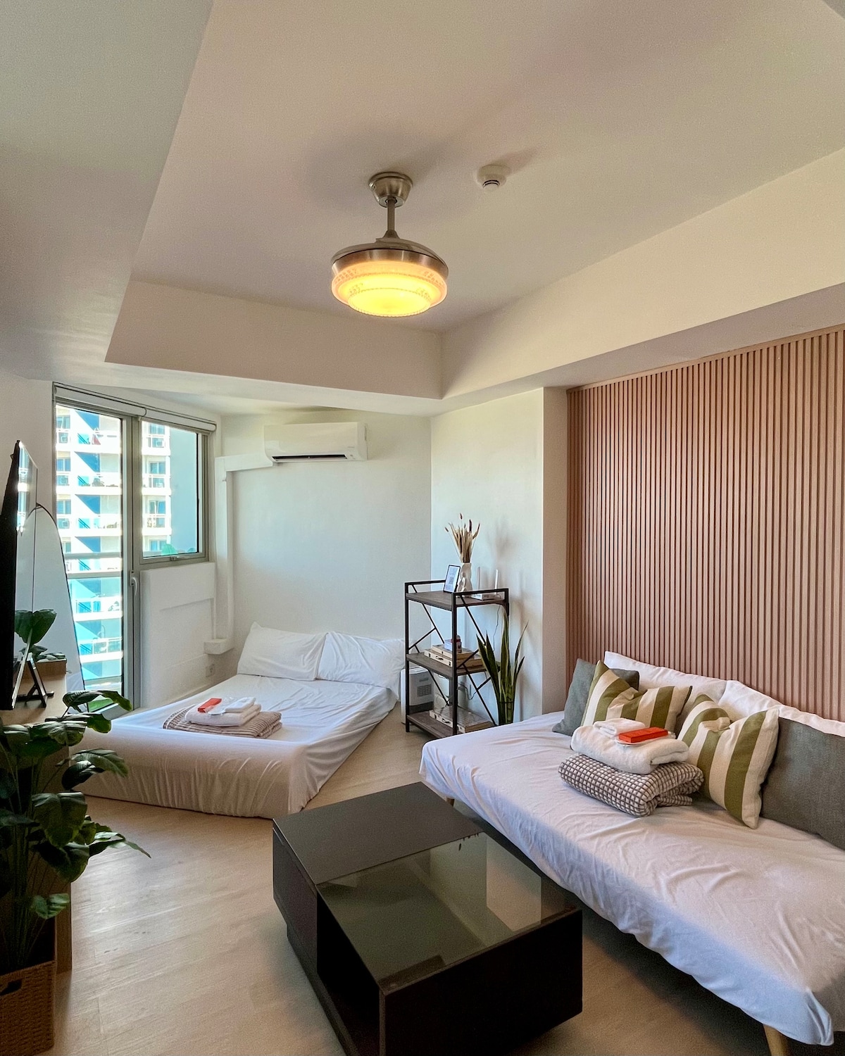 Angelic Premier Residences ist nah genug an SM, Korea Town, Restaurants und Bars, aber weit genug entfernt, dass es nicht zu laut ist. Das Gebäude verfügt über einen Fitnessraum, einen 24-Stunden-Pool auf der Dachterrasse und eine Sportbar mit Billardtisch. Es gibt einen gemeinsamen Parkplatz vor der Wohnung, der nach dem Prinzip „Wer zuerst kommt, mahlt zuerst“ genutzt wird, sowie einen zusätzlichen Parkplatz auf der anderen Straßenseite. Dies ist eine voll ausgestattete 1-Zimmer-Wohnung mit einfachem Check-in, 2 x Netflix-Fernseher, 200 Mbit/s Glasfaser-Internet, 1 x Kingsize-Bett, einem zusammenklappbaren Einzelbett und einer bequemen Couch!