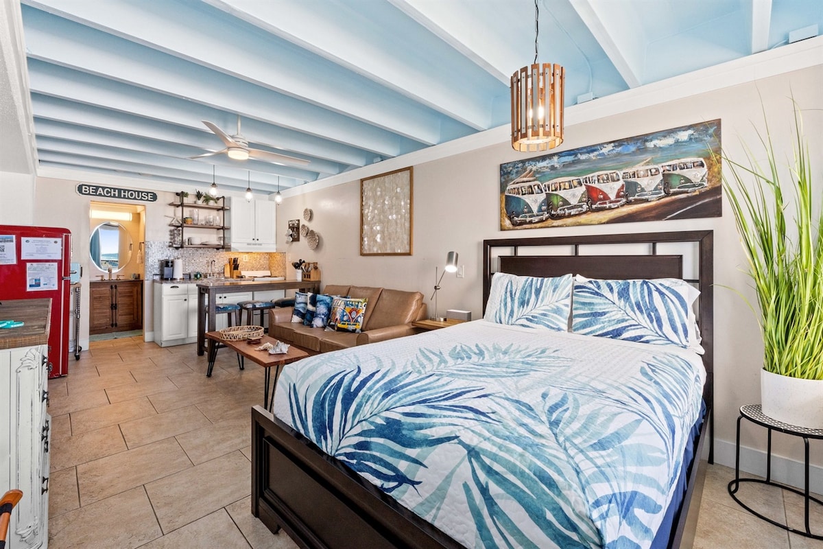 KOSTENLOSE STRANDSTÜHLE/-SONNENSCHIRME (15. März bis 31. Oktober 2026). Der Komplex wurde im März 2026 renoviert und das Studio wurde 2023 umgebaut. Wir befinden uns DIREKT am Strand im schönen PCB, mit deinem eigenen, privaten Balkon!! Das Zimmer verfügt über ein Kingsize-Bett, ein Zweisitzer-Sofa, einen Sessel und eine voll ausgestattete Küche und einen Geschirrspüler. Das Badezimmer verfügt über eine schöne ebenerdige Dusche. Der Pier Park und viele Restaurants sind zu Fuß erreichbar. Neue 2024 Visa/Münz-Waschküche auf dem Grundstück. Wir haben ein Strandcafé und einen beheizten Pool!