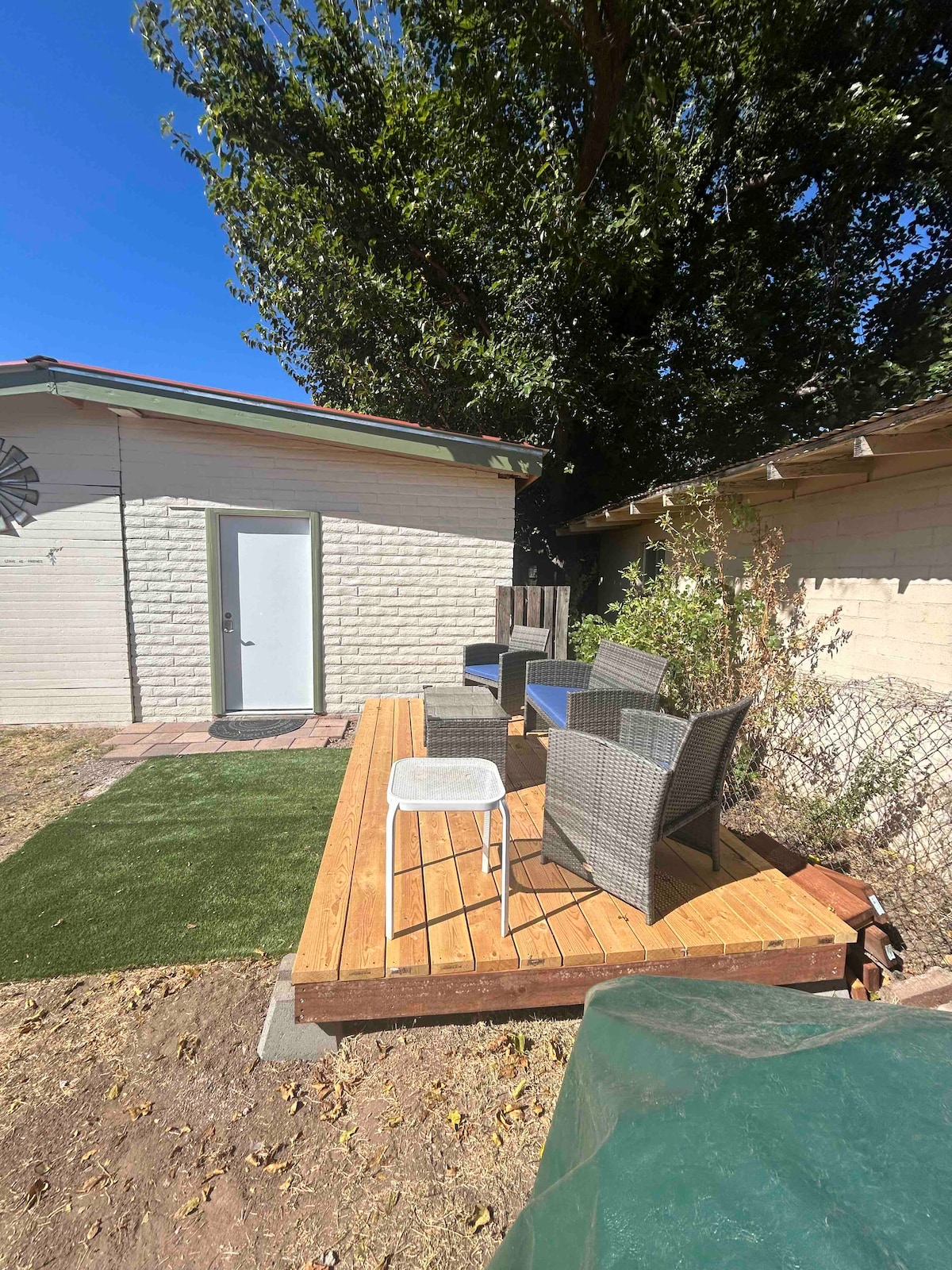 A guesthouse, nestled in a grove of mesquite trees, located just a block away from the local shops downtown awaits your arrival. A full kitchen, supplied with the basic conveniences, bedroom with queen size bed and twin sofa bed, and bathroom with shower, make this space a perfect fit for a couple or small family. The front living room has a futon couch and smart TV.