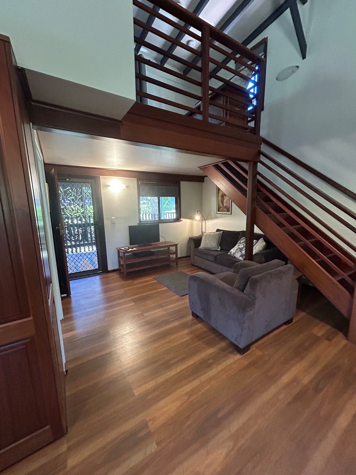 Geräumige, unabhängige Wohnung mit 2 Queensize-Betten, eines im Obergeschoss. Großes, modernes Badezimmer mit separatem WC im Erdgeschoss. Privater Eingang und Parkplatz auf 8 Hektar Buschland. Geräumiger Wohnbereich mit Lounge, Esszimmer, Küche mit Kühlschrank und Mikrowelle und kleinem Backofen, die Küche verfügt über grundlegende Kochgeräte. Die Küche ist mit Geschirr, Besteck, Gläsern, Toaster, Kanne, Tee und Kaffee ausgestattet. Es gibt einen Grill auf der Außenterrasse.