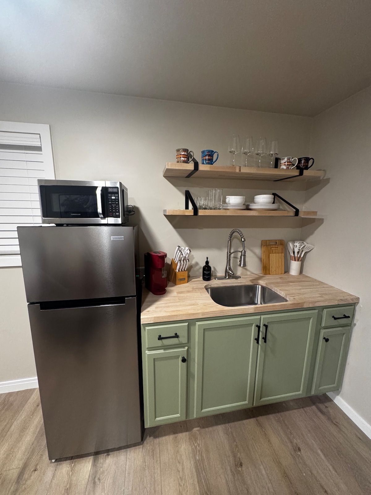 Ein Schlafzimmer, Queensize-Bett, Luftmatratzen verfügbar, komplettes Badezimmer mit Dusche. Parken vor dem Laden. Küche: großer Kühlschrank, Mikrowelle, Toaster und Keurig. Durchgehend Betonböden, haustierfreundlich. Max. 4 Gäste ohne Genehmigung. Wohnmobil-Stecker mit Durchfahr-Parkplatz vorhanden. Alle nicht registrierten Gäste, die sich nach 23:00 Uhr in der Unterkunft aufhalten, werden als zusätzliche Bewohner berechnet. KEINE UNBEFUGTEN PARTEIEN ERLAUBT. Du wirst aufgefordert, die Unterkunft zu verlassen, und eine Veranstaltungsgebühr wird erhoben.