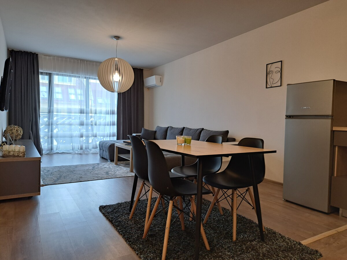 Заповядайте в нашия апартамент направен с много желание и любов за Вас! В него ще намерите всичко необходимо, за Вашия приятен престой. Намира се в нов жилищен комплекс с асансьор в близост до Lidl, денонощен супермаркет, ресторанти , кафенета и аптеки на 10мин. пешаходно разстояние от идеалния център на града.Свободно паркиране. Апартаментът разполага с напълно оборудвана кухня, телевизор с включени HBO, Netflix, и пълен пакет цифрова телевизия и интернет. Разполага също и с пералня и сушилня.