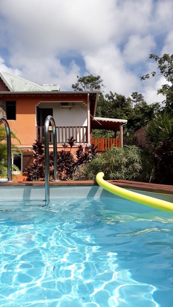 T2 HARMONIE mit Zugang zum Familienpool (privatisiert beim Wechsel der Mieter) unten in der Villa mit separatem Eingang, Parkplatz, Wassertank und Solaranlage bei Stromausfall. In einer Gegend mit grüner Landschaft und ruhiger Atmosphäre. 5 Minuten von der Kassaverie und den Flüssen entfernt, befindet sich der Canyon de la Moustique, von außergewöhnlicher Schönheit, ideal zum Wandern. Gewerbegebiet 10 Min. (kleines Einkaufszentrum, Restaurants, Apotheke, Ärzte).