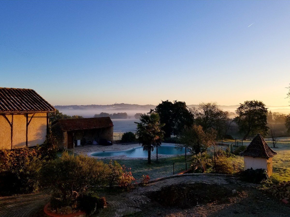 Schönes, geräumiges, lichtdurchflutetes Haus mit schöner Aussicht über die Landschaft des Gers. Genieße unabhängigen Zugang, ein eigenes Badezimmer, einen Küchenbereich und zwei Sofas mit Blick auf ein riesiges Panoramafenster. Ein Sofa ist ein Schlafsofa, das es bis zu sechs Personen ermöglichen würde, sich es zu teilen. Draußen gibt es einen wunderschönen Pool und einen großen Gartenbereich sowie einen riesigen Holztisch im Schatten von zwei großen Bäumen. Bitte zögere nicht, dich für weitere Informationen bei uns zu melden. Wir haben zwei große, freundliche Hunde, verschiedene Katzen und zwei Pferde.