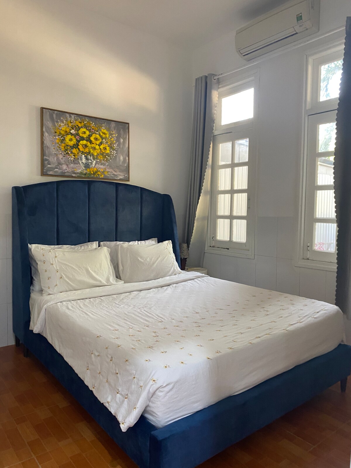 In the heart of the city, this spacious villa boasts 3 bedrooms and 3 bathrooms. There is a sunlit living room, fully-equipped kitchen, guest toilet on the ground floor. Enjoy lush green surroundings, a garden with a decorative pond, and a parking for scooters and one car. Amenities include AC in living and bedrooms, WiFi, 2 TVs, washing machine, dryer, and essentials like bedsheets and toiletries. Located near local foods, supermarkets, and 1.5 km from Doi Duong Beach.