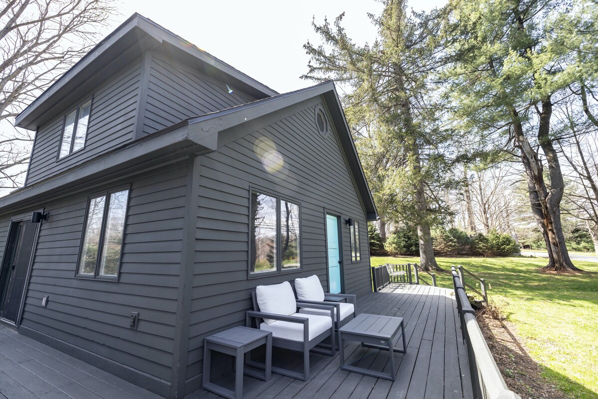 Gemütliches Haus mit 3 Schlafzimmern (5 Betten) und 2 Badezimmern auf 4 privaten Hektar im charmanten Ghent, New York. Das kürzlich renovierte Arch Bridge Chalet bietet modernen, sauberen Komfort mit offenem Grundriss, luxuriösen Badezimmern, hochwertigen Geräten und Kochgeschirr, einem Holzofen, einer Außenterrasse und Feuerstellen. Umgeben von Bäumen, Wanderwegen und Bächen, aber in der Nähe von Hudson Valley Bauernhöfen, Brauereien, Berkshires Skifahren und der pulsierenden Stadt Hudson. Perfekt zum Wandern, Radfahren, Kajakfahren, Skifahren und für ganzjährige Kurztrips.