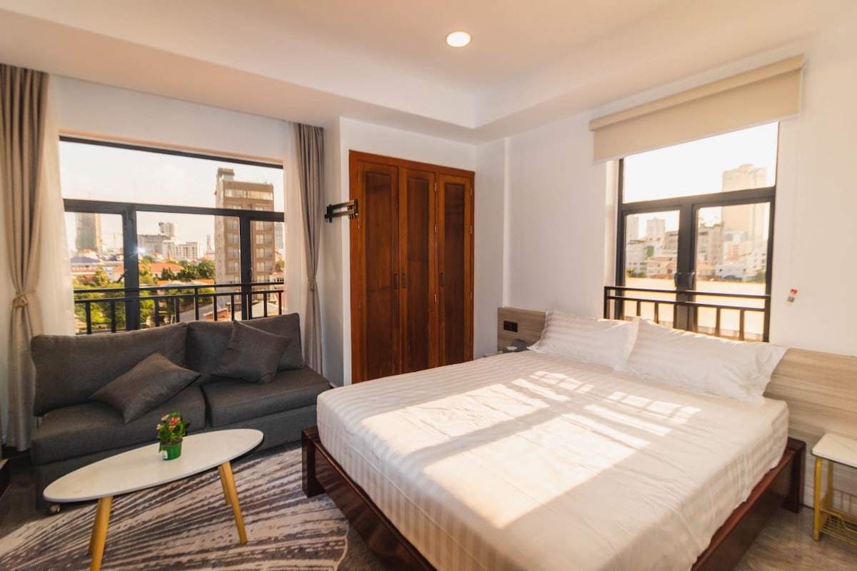 Willkommen in deinem eleganten, lichtdurchfluteten Refugium im Herzen von Phnom Penhs pulsierendem Riverside-Viertel! Du findest einen ultra-sauberen, ruhigen Raum — ein liebevoll restauriertes persönliches Refugium in einem authentischen Gebäude im Khmer-Stil aus der Kolonialzeit — jetzt offen für Gäste, die Eleganz und kreativen Charme schätzen. Du wirst dein Riverside-Juwel lieben – wo urbane Energie auf stilvollen Komfort trifft. Genieße morgens Kaffee auf deinem eigenen Balkon, während die Stadt aufwacht, und genieße einen atemberaubenden Blick über die Dächer.
