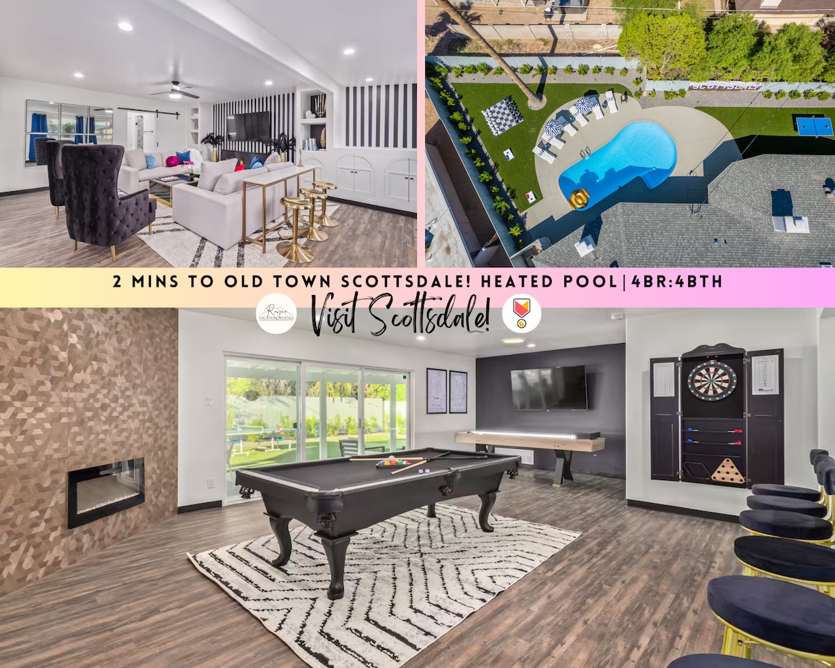 Luxus 4 Schlafzimmer mit 4 eigenen Badezimmern, insgesamt 5,5 Badezimmer. Kurzer Spaziergang zum Lebensmittelgeschäft, zu Restaurants, Bars und Einkaufsmöglichkeiten. Komplett renoviert. Perfekter offener Grundriss, der sich von der Küche über den Hinterhof bis zur Restaurantbar im kommerziellen Stil erstreckt! Voll ausgestattete Bar mit mehreren Fernsehern, 2 Kegelautomaten und einem übergroßen Gefrierschrank für frostige Gläser. Beheizter Pool 75 € pro Nacht. Alles ist praktisch, sauber, neu und komfortabel! Neue Möbel. Schneller Zugang zur Altstadt von Scottsdale und zur Camelback Road!