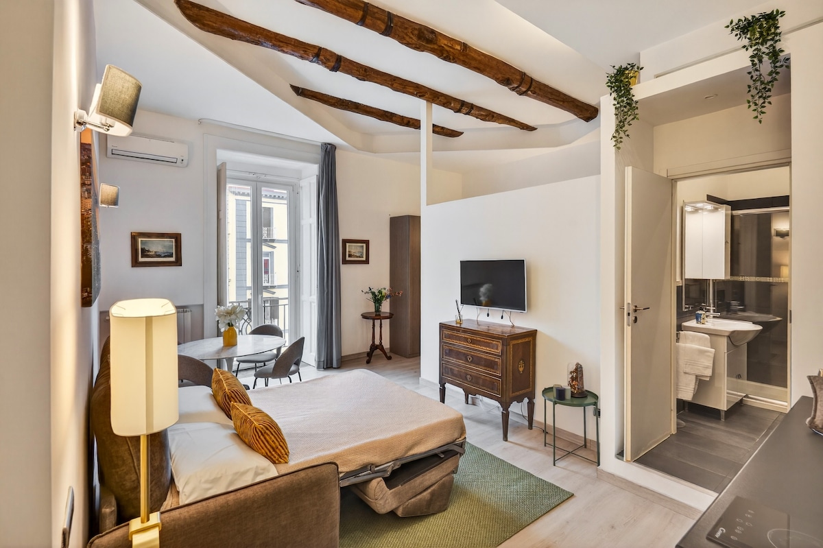 Es ist ein kleines, stilvolles, offenes Loft, das gerade restauriert wurde, in einem alten Gebäude aus dem 18. Jahrhundert (es gibt einen Aufzug!) im Herzen von Neapel, in der Nähe des Plebiscito-Platzes. Die Wohnung verfügt über ein Wohnzimmer mit einem „Tatami“-Schlafsofa und einen Küchenbereich, einen Esstisch, einen kleinen Kleiderschrank und ein Badezimmer. Über eine Treppe gelangst du in die obere Etage mit Holzbalken, einem Doppelbett und dem Fernseher. Der Stil ist minimalistisch, inspiriert hauptsächlich von einer industriellen Produktion.